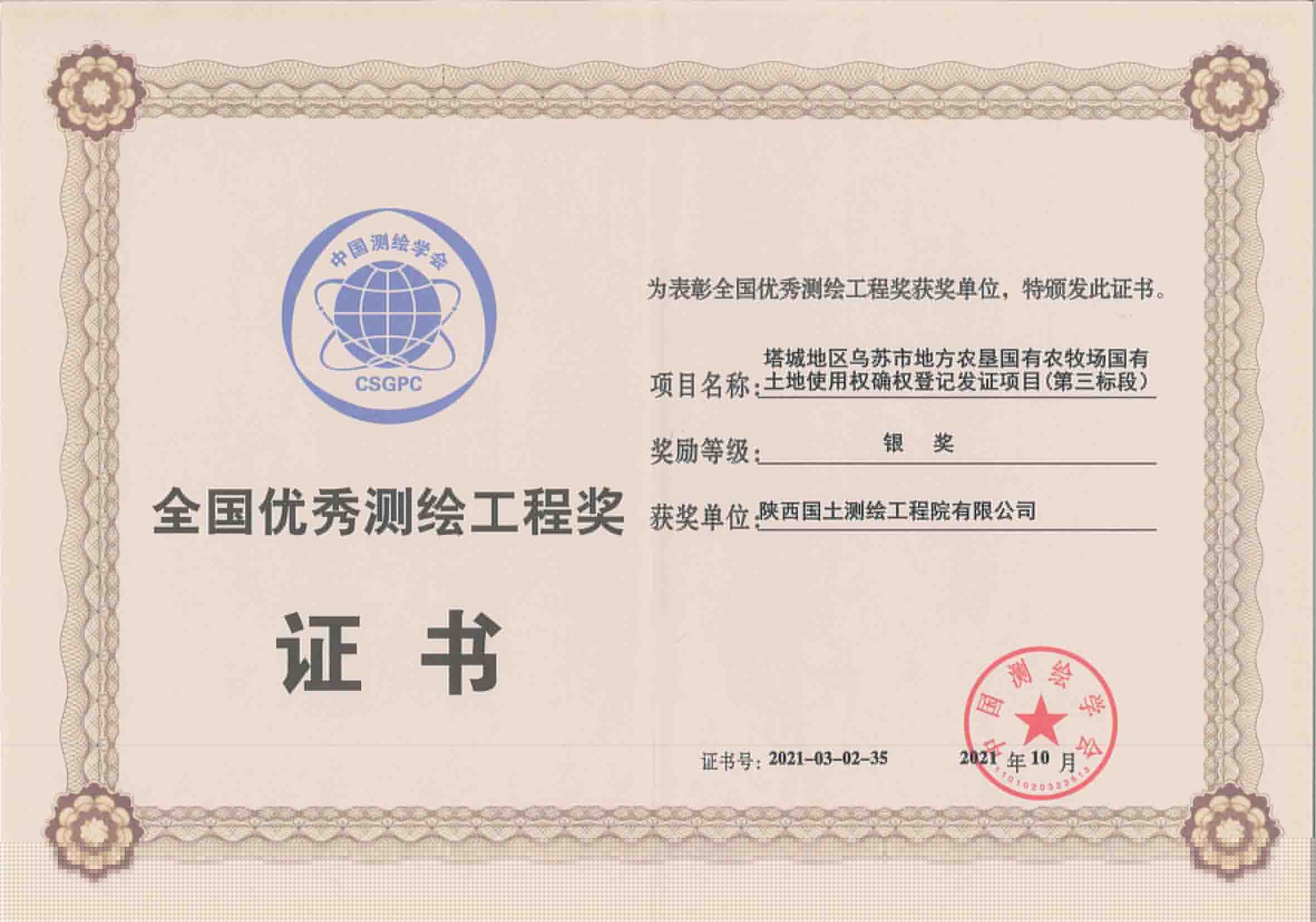 近日,陕西国土测绘工程院有限公司《塔城地区乌苏市地方农垦国有农牧场国有土地使用权确权登记发证项目(第三标段)》项目被评为“2021年全国优秀测绘工程奖银奖”,这是测绘院公司测绘项目连续三年获得全国优秀测绘工程银奖。全国优秀测绘工程奖是由中国测绘学会每年评选一次。2021年该奖评选出银奖66项。